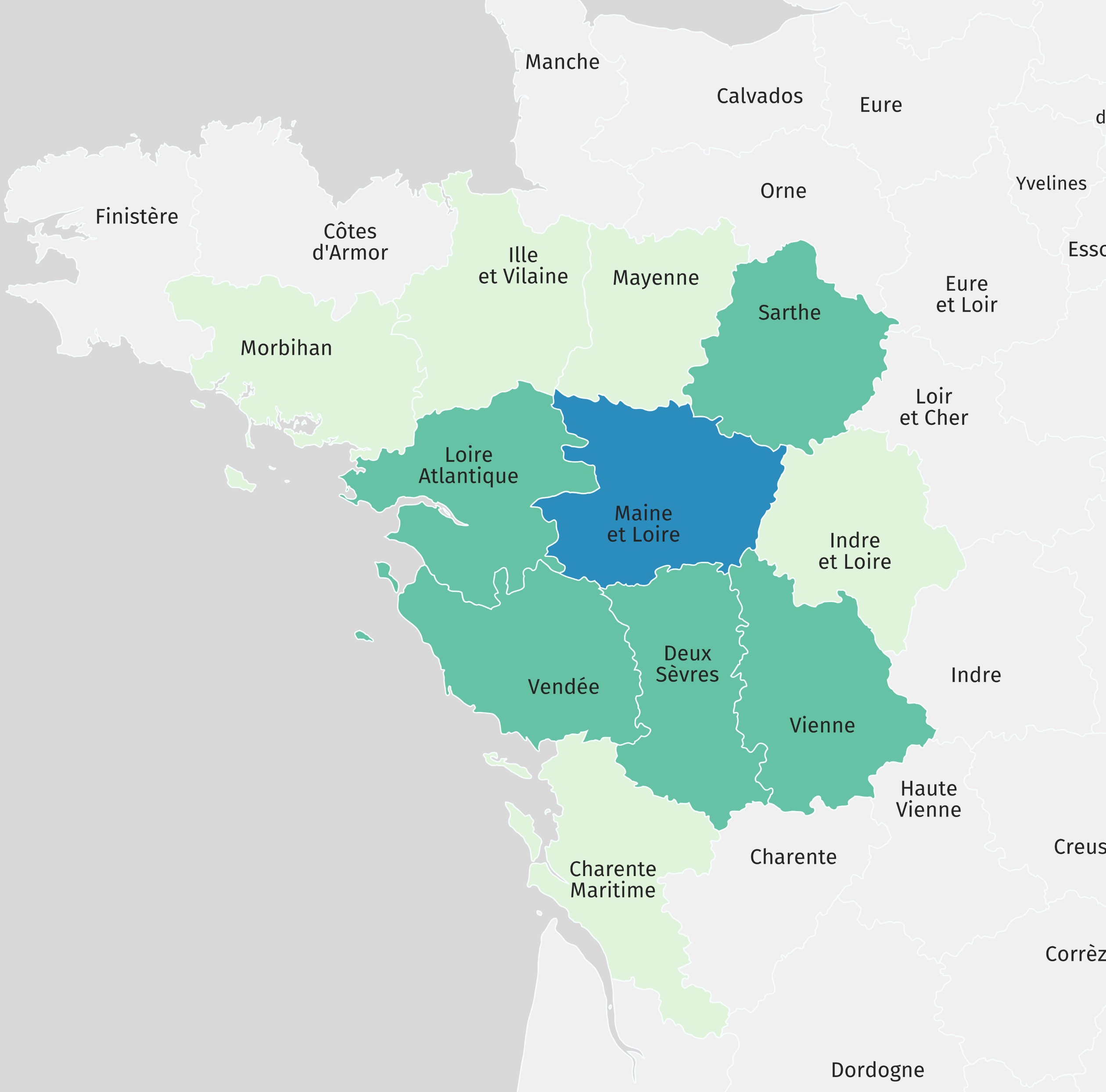 (Bleu : département principal ; vert foncé : départements possibles facilement ; vert clair : départements envisageables)